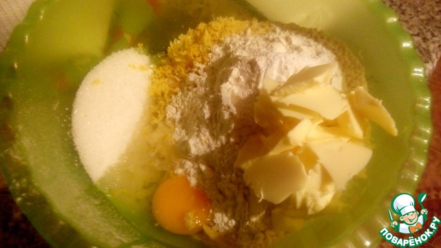 Натереть цедру с лимона, соединить с мукой и разрыхлителем. Добавить сливочное масло, сахар, яйцо. Замесить тесто. |