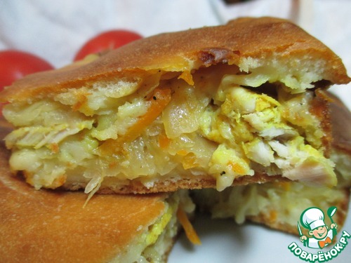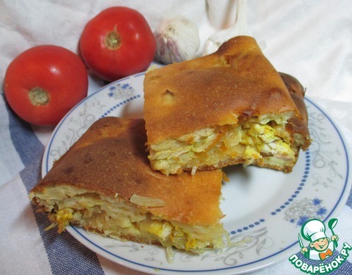 Заливной пирог с квашенной капустой и с филе индейки, замаринованном в карри и чесночном порошке, очень прост в приготовлении. Но результат очень вкусен! Тесто такое мягкое, нежное получилось... и при этом его не много... Начинка в меру острая. Мясо индейки со специями очень гармонично туда вписалось, но для более простого варианта, можно копчёностей нарезать в начинку))) Отличный закусочный вариант.