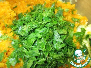 Нарезать мелко зелень и добавить её к овощам.