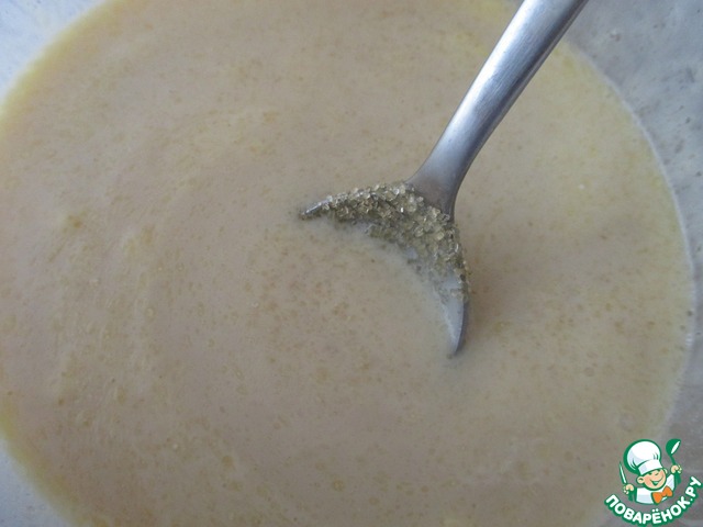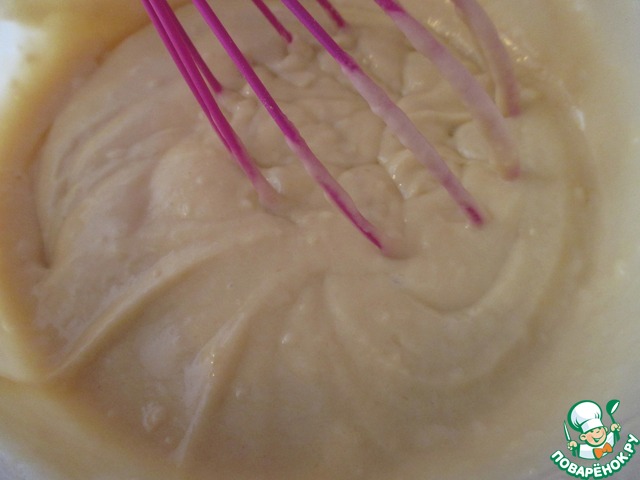 • В муку добавить разрыхлитель и просеять в жидкие ингредиенты. Просеивать понемногу и постоянно перемешивать венчиком, что бы не было комочков.