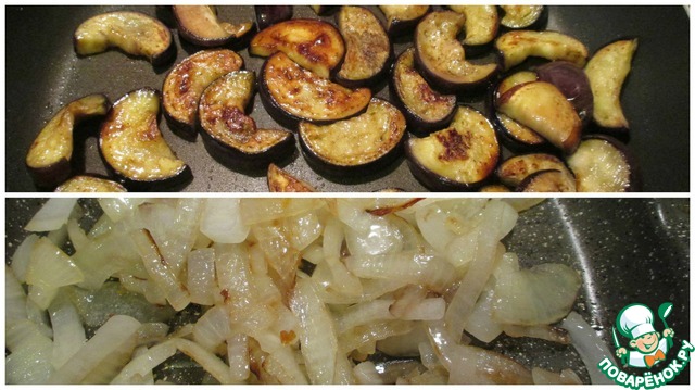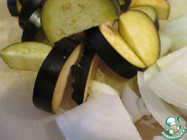 Баклажаны нарезать полукольцами (толщиной примерно 1 см), лук четвертькольцами