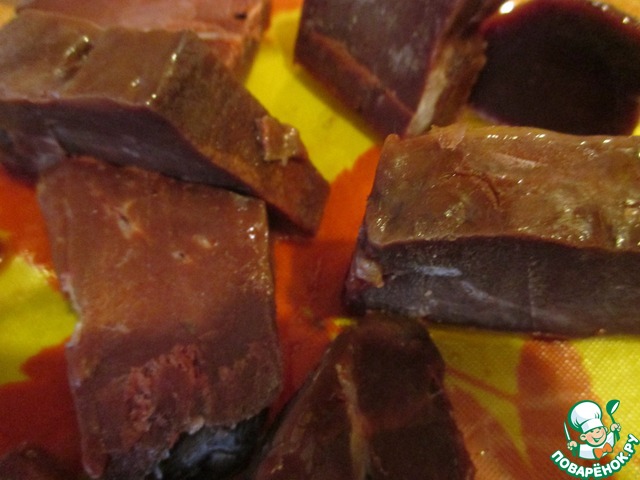 Печень (я брала замороженную), очистить от плёнки, обдав кипятком. Нарезать на ломти толщиной 1,5 см и чуть разморозить, но не до конца.