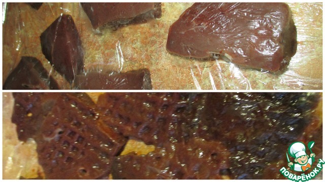 Печень выложить на пищевую плёнку и накрыть сверху ей же.