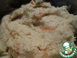 Добавить в остывшее пюре капусту, обжаренный лук, панировочные сухари, перец чёрный и посолить по вкусу. Добавить яйцо. Хорошенько перемешать и оставить минут на 20, чтобы сухари разбухли. Сухарей может понадобиться больше или меньше, в зависимости от консистенции фарша-пюре.