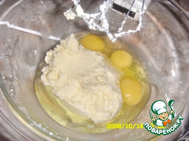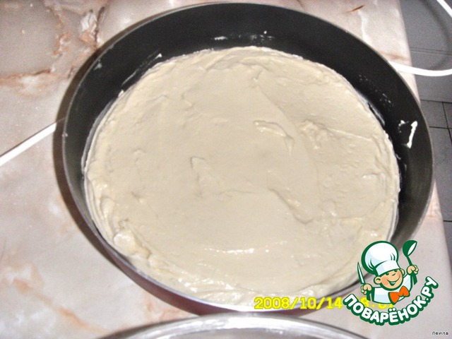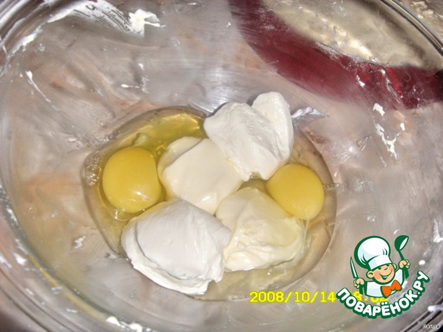 ЗАЛИВКА: Взбить сыр со сметаной, яйцами, после добавить пудинг сухой.