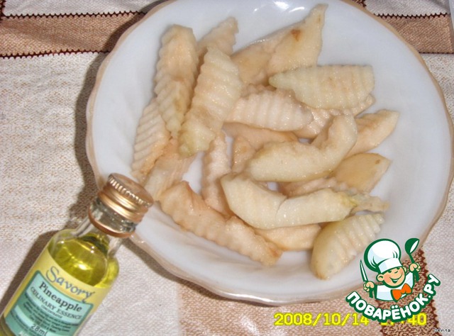 Груши естественно заранее почистить, отделить от сердцевины, нарезать в любую форму, я смешала их с ароматизатором ананаса.