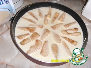 Наливаем заливку на тесто, сверху уложить груши, кладем выпекать в разогретую духовку.
