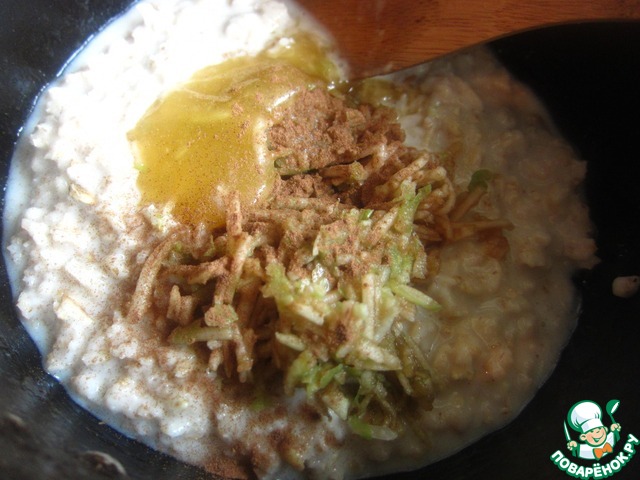 Добавляем натертое яблоко в кашу (оставьте немного для сл. этапа), а также мед и корицу. Все это хорошенько перемешиваем.