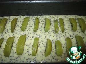 Вылить в неё тесто, и кружочки киви воткнуть в два ряда, достаточно близко друг от друга.