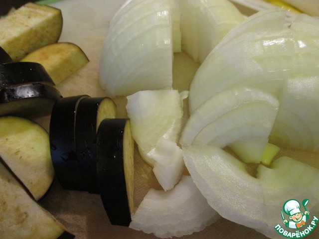 Порезать баклажаны полукольцами толщиной примерно 1 см. Лук порезать так же полукольцами или четверькольцами.