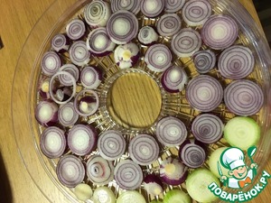 Нарезать лук лучше толщиной не более 3 мм. Хотя кому как нравится. Заполнить все ярусы сушилки и установить температуру 70 градусов. Я в процессе сушки меняю ярусы местами, верхние вниз, просто по кругу.