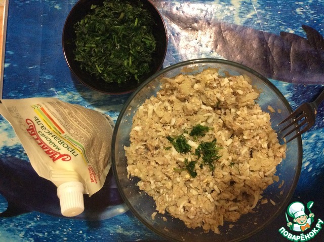 Я брала сайру с добавление масла, измельчаю вилкой. Предварительно отварила 4 яйца, картофель, лук очистила и приготовила для измельчения. Зелень