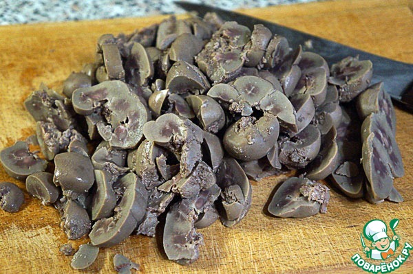 Почки вынуть из бульона, немного остудить, порезать пластинками толщиной примерно 5 мм.