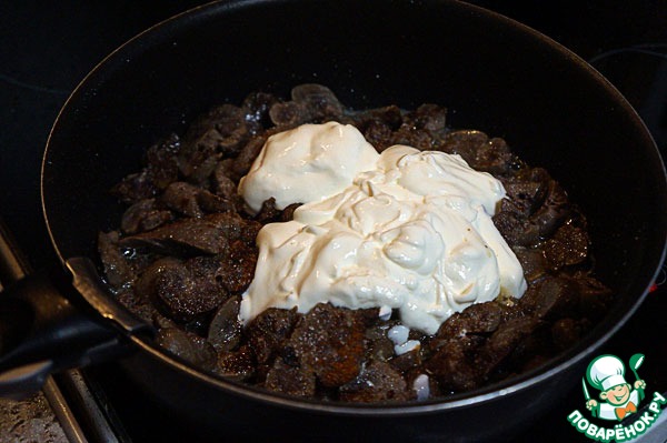 Добавить оставшуюся треть сметаны, посолить, поперчить, накрыть крышкой и тушить на малом огне 50 минут.