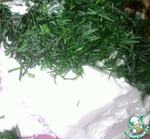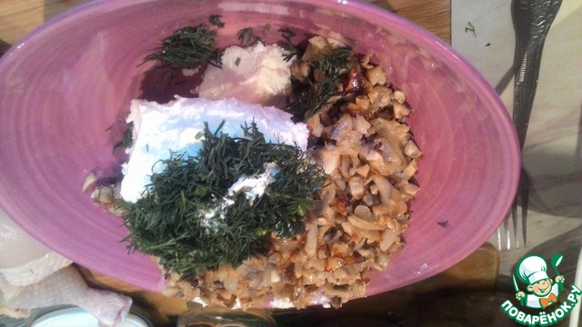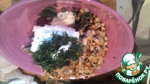 • Грибы с луком уже остыли, теперь можно соединить их с сыром и укропом.