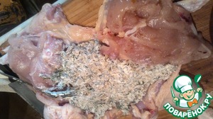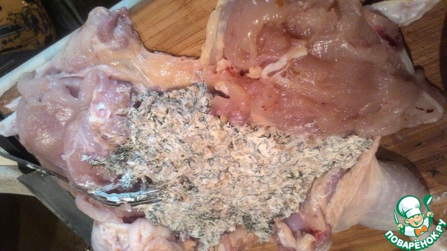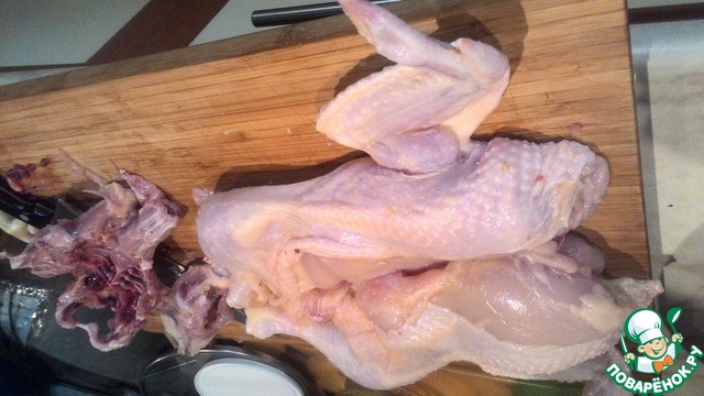 • У тушки курицы удаляем косточки. Поскольку я не профи в этом деле и такая процедура наверняка займёт очень много времени у меня.. острым ножом удалила только грудину, позвоночник и рёбра. В общем всё, что находилось в середине тушки.