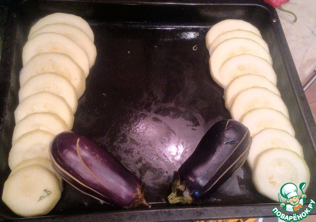 • Кабачок очищаем от кожуры и нарезаем кольцами. На баклажанах делаем надрезы вдоль. Выкладываем овощи на противень, предварительно смазав его маслом.