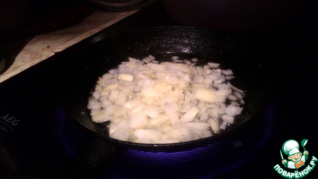 • Нарезаем репчатый лук кубиками, обжариваем на масле до золотистого цвета.