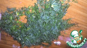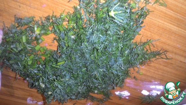 • Если сыр фета, то просто выкладываем из упаковки в миску к укропу. Если сыр другой, например п/твёрдый, то сначала натираем мелко на тёрке.