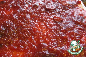 Теперь нужно смазать противень маргарином, посыпать мукой, и выложить ровным слоем тесто.