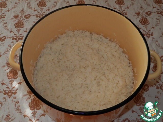 Рис промыть и отварить в подсоленной воде. Откинуть на дуршлаг, дать стечь.