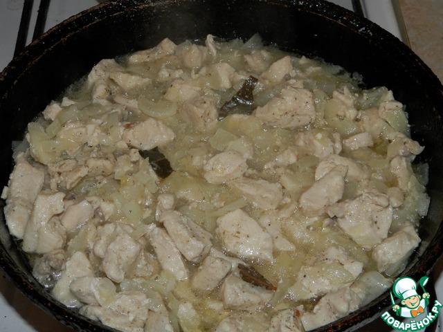 Куриную грудку без шкурки и костей промыть, нарезать небольшими кусочками. Слегка обжарить на растительном масле вместе с порезанным луком.