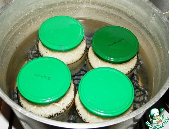 На дно большой кастрюли положить чистое полотенце, поставить на него банки и залить их водой по плечики. Накрыть крышками. Довести воду до кипения, убавить огонь. Накрыть кастрюлю крышкой и стерилизовать 30-40 минут банки, ёмкостью 0,7 л.