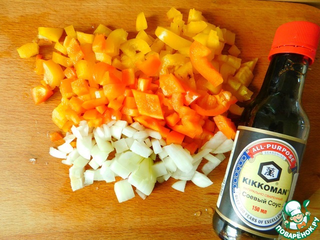 Для этого нарежем кубиком мякоть сладкого перца и луковицу.
