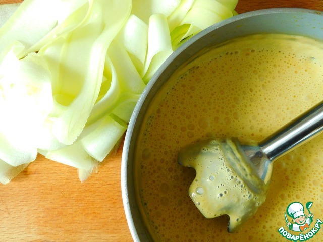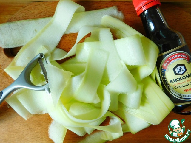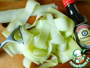 Пока соус тушится, кабачок очистим и нарежем лентами с помощью овощечистки.
