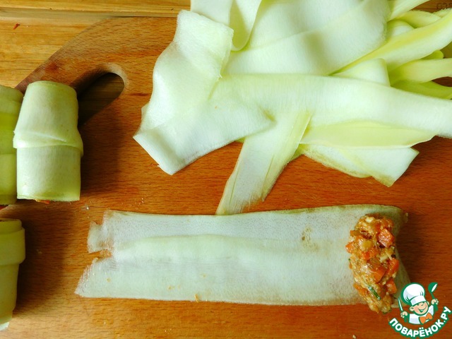 На доске складываем внахлёст по 2-3 ленты кабачка ( в зависимости от их ширины).