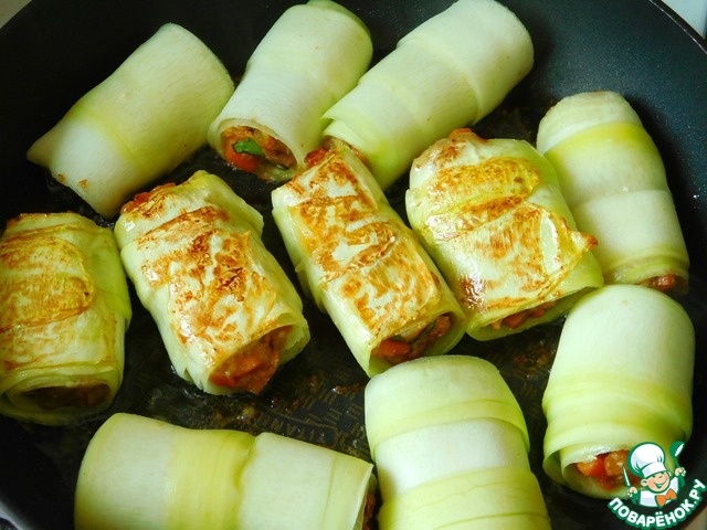 На сковороде разогреваем оставшиеся 2 столовые ложки растительного масла, выкладываем кабачковые рулетики сначала швом вниз.