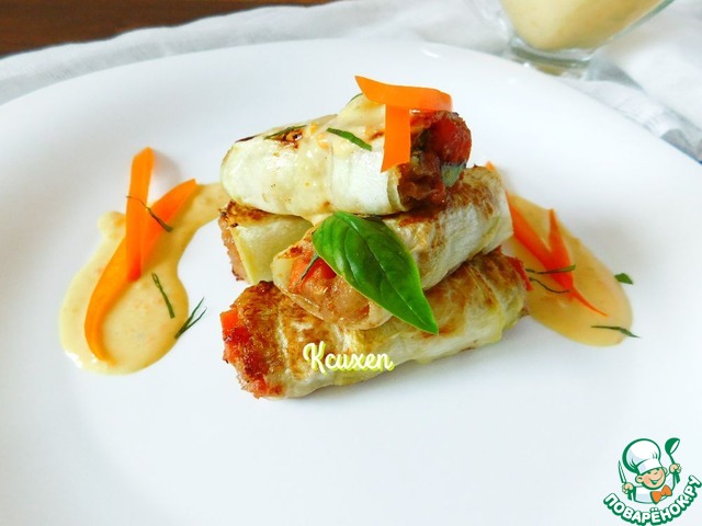 Рулетики из кабачков с морковной начинкой, а в дополнении густой соус из сладкого перца.