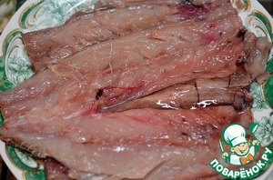 Разложить филе мясом кверху внахлёст, посолить по желанию, поперчить, посыпать сухим желатином, на него разложить тертую морковь, яйца и огурчики.