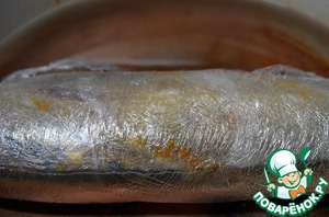 Свернуть в рулет, вкладывая тушки рыбы друг в друга «валетом», в пищевую плёнку.