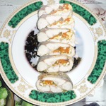 Варить в подсоленной воде 40 мин. Готовый рулет еще горячим поставить под пресс, не снимая пленку до полного остывания.
