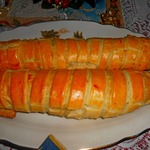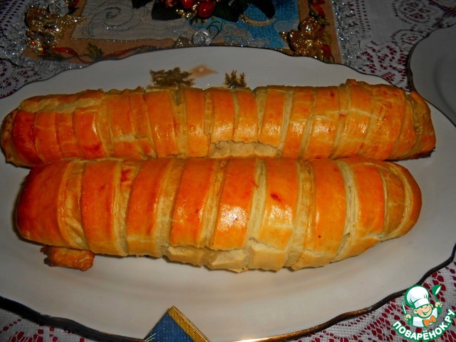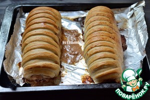Аналогично сформировать второй рулет, выложить их на противень на бумагу или фольгу и смазать льезоном (для льезона взбить яйцо с добавлением молока и соли)