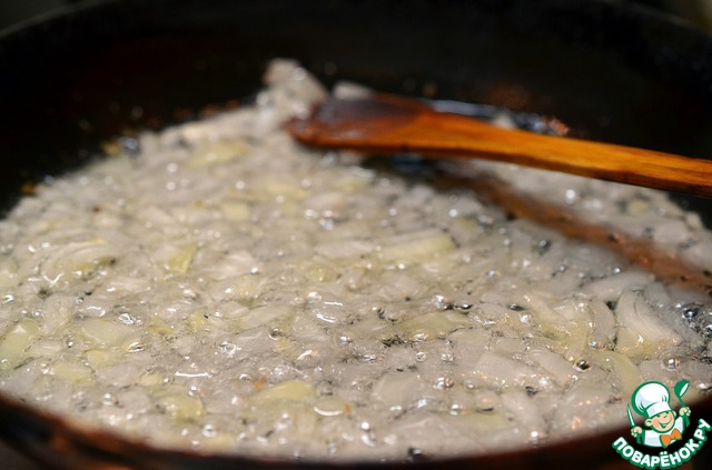 В большой сковороде с толстым дном обжарьте в оливковом масле нарезанный лук и чеснок, 5 мин.