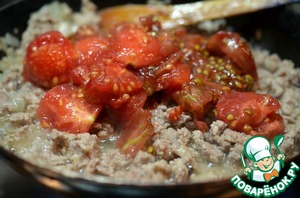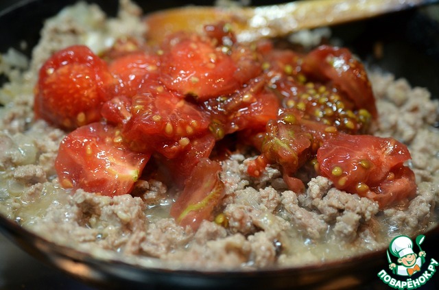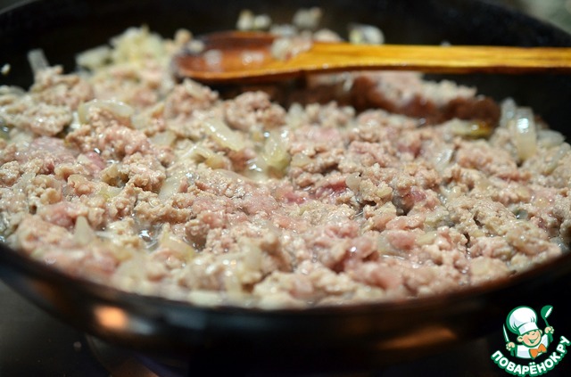 Добавьте мясной фарш, обжарьте на сильном огне, разбивая комки вилкой или деревянной ложкой, пока весь фарш не изменит цвет.