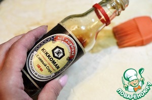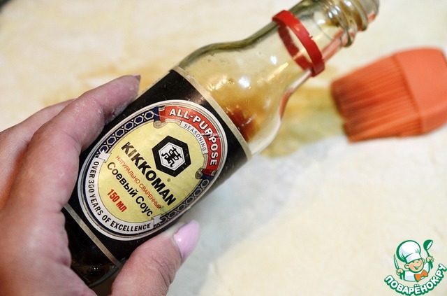 Раскатайте тесто в тонкие пласты. Смажьте соевым соусом.