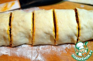 По сути рецепта докладываю. Из дрожжевого теста не получились. Все расплылось, развалилось, помучилась, отрезала 3 "розочки", бросила и выложила весь рулет целиком на противень. Вот он испекся хорошо, было удобно резать ломтями - большое преимущество против пирогов, кусок пирога в руку не возьмешь - он раскрывается и вываливается начинка, только на тарелочке при помощи ножа и вилки)).