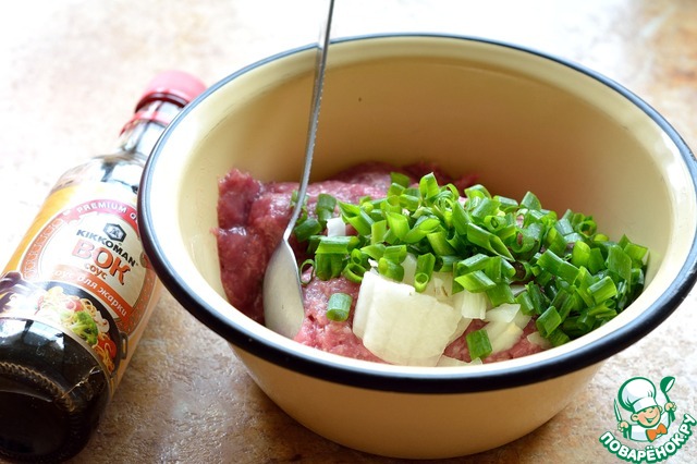 К фаршу добавить рубленный лук, соевый соус, хорошо перемешать (можно подсолить при надобности, я не солила)
