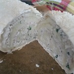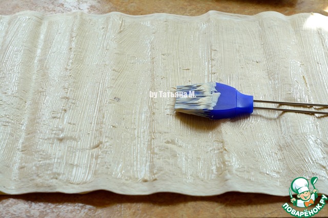 Затем рулет смазать сметанной смесью и завернуть еще в один пласт лаваша.
