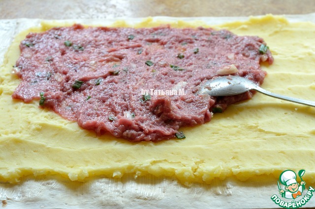 На смазанную часть пласта выложить картофель, разровнять, оставляя отступы со всех сторон.