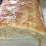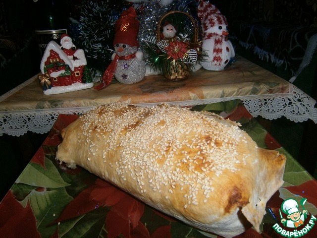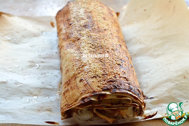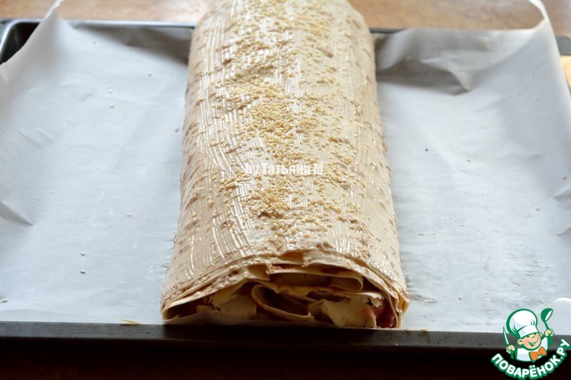 Выложить рулет на пергамент на противень, смазать снова сметанной смесью и посыпать кунжутом. -