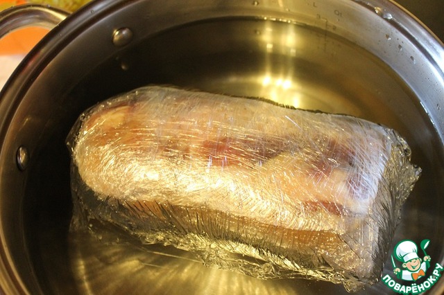 Полученный рулет завернуть в пищевую пленку, не менее 10 слоев, и положить в кастрюлю с водой. Довести до кипения и варить на медленном огне 2 часа.