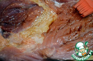 Положить мясо на разделочную доску. Сделать по центру вдоль волокон надрез, не доходя до низа 0,5 см. Раздвинуть мясо руками и сделать глубокие поперечные надрезы внутри кусков пласта справа и слева, не доходя до каждого края 0,5 см. Раскрыть кусок мяса, как книгу. Накрыть мясо пленкой и отбить молотком так, чтобы толщина слоя составила 1,5–2 см.