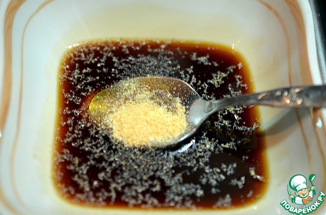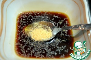 Приготовим глазурь: смешаем мед, 1 ст. л. соевого соуса и сухой чеснок.