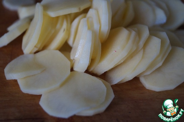 Картофель порезать тонкими кружочками. Можно воспользоваться специальной тёркой.