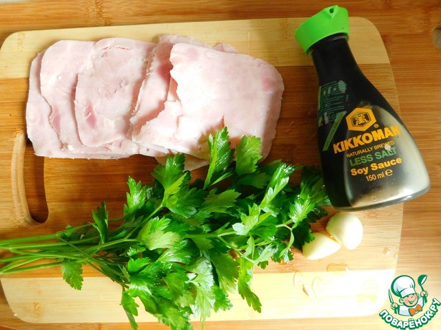 Подготовим продукты - ветчину тонко нарежем, петрушку ополоснём и обсушим. Мелко нарежем петрушку и зубчик чеснока. -
