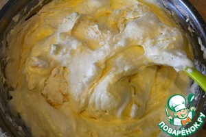 Взбитые яйца перекладываем в миску с уже просеянной мукой и аккуратно (лучше всего силиконовой лопаточкой) перемешиваем наши компоненты движениями снизу вверх, стараясь максимально сохранить воздушность массы.